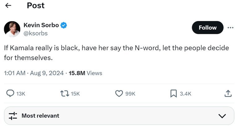 Kevin Sorbo, an actor known for his starring role as Hercules on a popular nineties TV show who is now a Trump activist, echoed Loomer’s post, writing: “If Kamala is really black, ask her to say the N-word, let the people decide for themselves.”