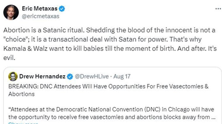 For example, right-wing activist Eric Metaxas, who has more than 210,000 followers on his monetized profile, wrote: “Abortion is a satanic ritual. Shedding the blood of the innocent is not a “choice”; it is a transactional agreement with Satan for power.